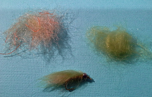 One part Flash Blend baitfish brush silver scale shrimp. - Over-body – Muz Wilson Fuzzle dub olive.