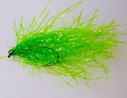 Good colours are White over white, Yellow over white or Chartreuse over white (as in the tying instructions below). Fish these around and over the weed beds.