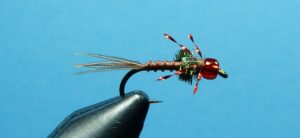 The Red Tag should be fished with plenty of floatant. This ensures it stays on the surface or just in the surface film. Use an unweighted nymph. Tie it with a very light line – 4lb. Attach it to the bend of the hook. These are most effective in moving water in the deeper parts of the river, using a floating line.