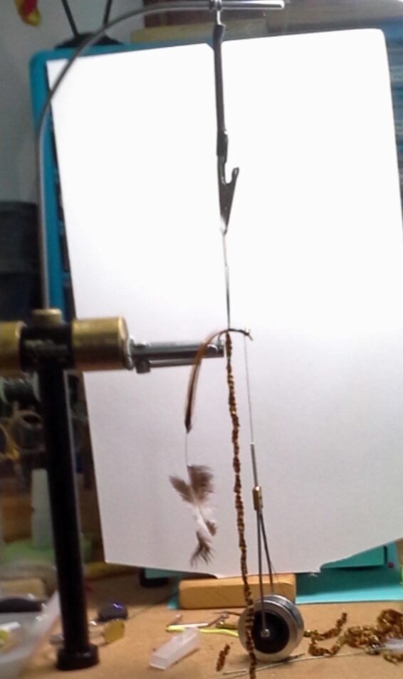 If you have no guillotine you can clip your hackle pliers to the tail for weight and wrap upside-down.