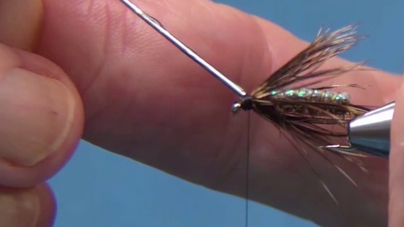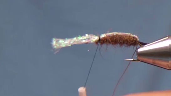 - Tie in the Dorsal Stripe: Bring the sparkle chenille forward, stretching it tight, and tie it just behind the eye.