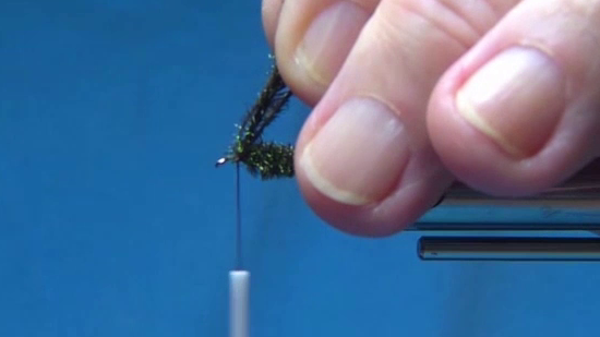 - Use the thread weight to hold the peacock herls together while wrapping back to the eye.