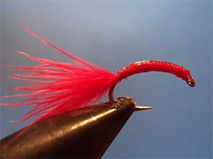 These red larvae, known by anglers as bloodworm, live the bulk of their lives in silt tubes, but when disturbed or migrating can move by a sinuous lashing motion. This action is almost impossible to replicate, but by adding a pinch of red marabou as a tail, enough action can be imparted to make an effective imitation.
