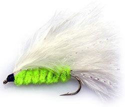 The marabou tail and wing pulse in the water, and the white and green colour combination is a true winner. Add to this the up-and-down effect when you retrieve, caused by the heavy chain bead eyes at the front, and the whole thing is exaggerated brilliant.