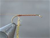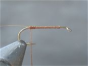 Next take a piece of copper wire and secure it to the hook at the rear of the fly. This wire should be tied in so that it protrudes out from the rear of the fly and is out of the way of your working space for constructing the rest of the fly. Once this is done trim the excess wire and cover with a few well placed turns of thread.