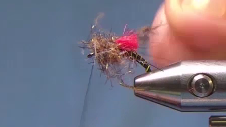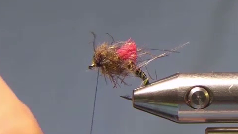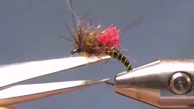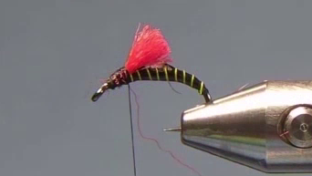 - Tie in the red soft fibres behind the eye and trim mid-body.