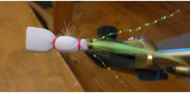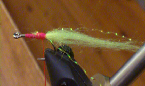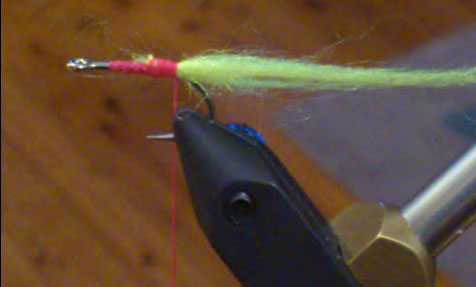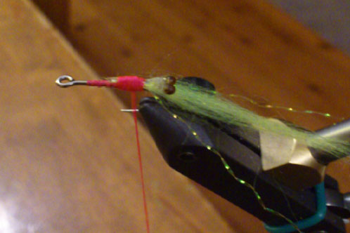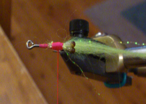 Thread – Fluorescent pink seems to be the best but I might be superstitious. Tail – Polar fibre, Chartreuse seems to be the most attractive to fish. “Ocean green” is also good. Orange “fish fuzz” also works fairly well. Strangely enough I haven’t had much success with shrimp coloured polar fibre. The chartreuse and shrimp colours seem to be the least prone to matting of all the colours, including olive, black and white. Could be something to do with the dyes used.