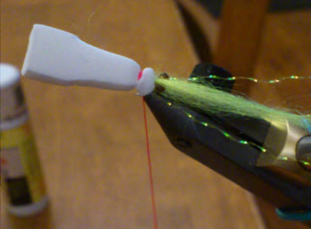 Burn mono for eyes and tie in so that they protrude out a short distance. Not too far but they should be exposed when the foam is tied in as in picture. See Photos 3 and 4.