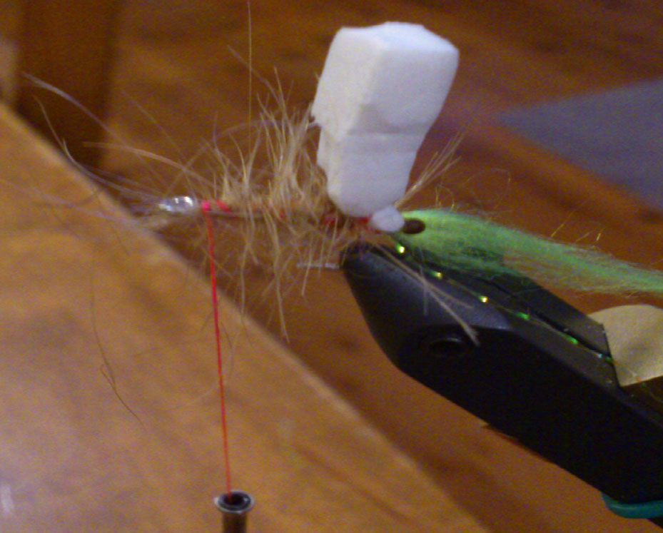 Tie in the other end of the foam next to the hook eye at the place where the foam changes into a wedge shape, see photos. I try to estimate the length of foam used so that I need to squeeze and stretch the “on shank” part a little to position the narrow part of the wedge just in front of the hook eye. That way the foam along the hook isn’t as buoyant and the front part of the fly will sink. There is a balance, of course, as you don’t want the fly to hang in the water too far towards the vertical. At least I think you don’t. It certainly won’t jump as well.