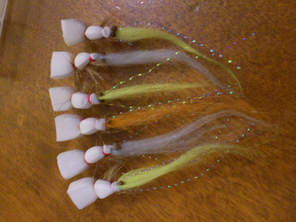 Hook – Size 8 Mustad 34007 stainless steel “O’Shaughnessy” (of course) are what I am using at the moment. Experiment with sizes if you like. The original hooks I used were Mustad short shank, wide gape size 9 stainless steel. Can’t find them these days.