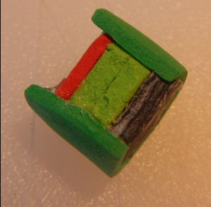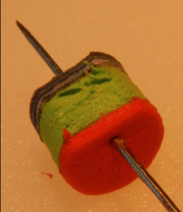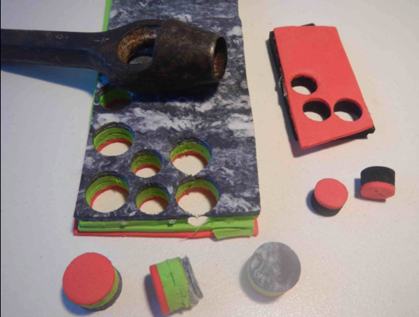 - Glue a few sheets of closed cell foam together (about 10mm thick) with super glue and hit with a hole punch. This makes a multi-coloured cyclinder.