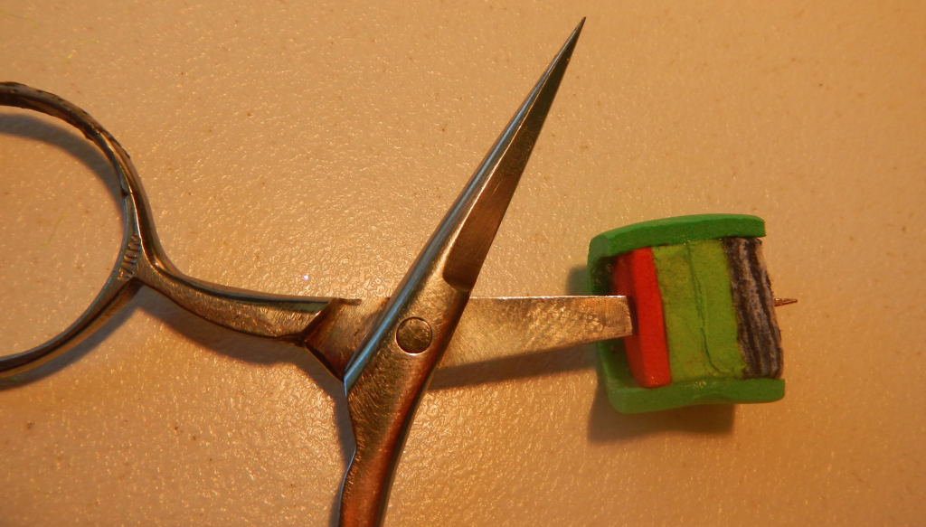 - Laminate several layers of closed cell foam – super glue or contact cement – various colours – to about 10mm thick. This can vary depending on hook size and length – the head is about half the length of the shank.