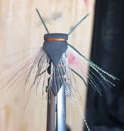 - Large foam pointed tail at the back of the chenille. Tie in first segment then tie in set of rubber legs, wrap around the segment.