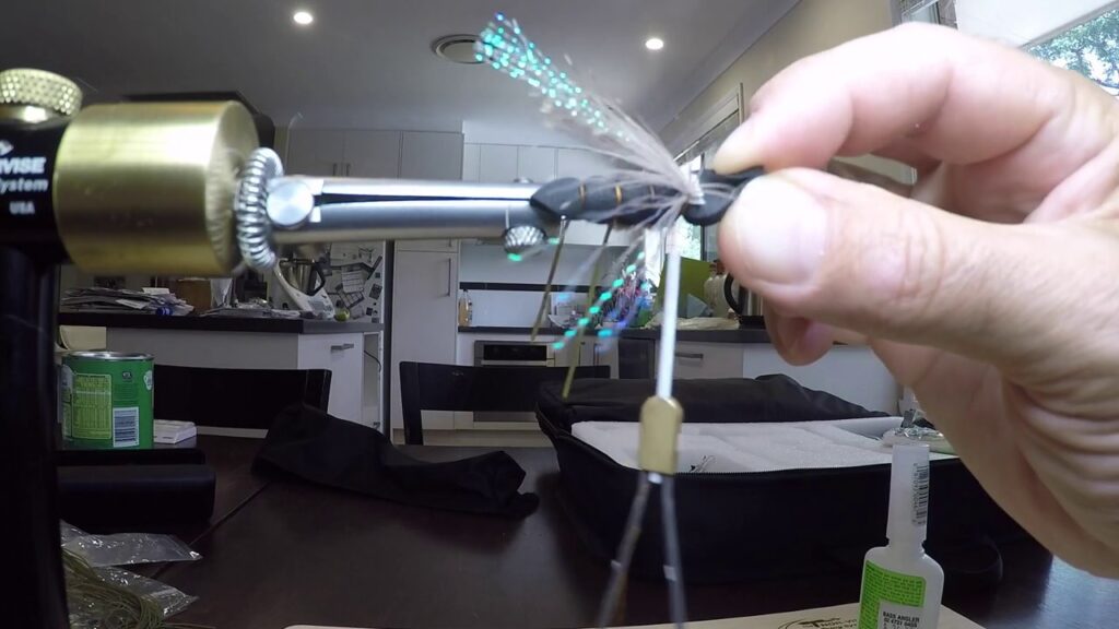 - Tie 8 or more crystal flash strands on the top of the fly – cut half body length past the tail.