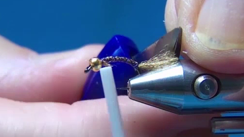 - Tie in a length of gold Holo tinsel on top of the hook, from the bead back to the head.
