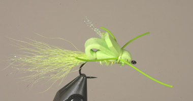 Cut a piece of rubber long enough for two legs. Fold the rubber over the thread and wind them securely to the body on the back side of the fly. Do the same procedure on the side of the fly near you. Whip finish then add some more super glue to the wraps being careful not to get too much on the legs themselves making them stiffer. You can use several legs on each side, use fine rubber for more action or use medium round rubber and only four legs like I did here.