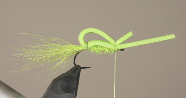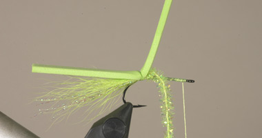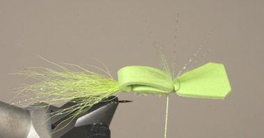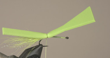 Tie down the foam body behind the hook eye at the base of the triangle. Make several tight wraps.