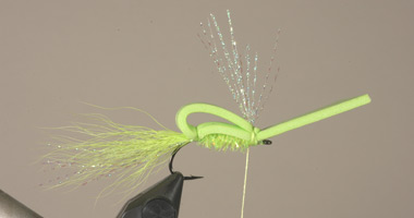 At this point I put a drop of super glue on both wraps at the front and back of the fly where the foam was tied in. Make sure the glue soaks into the wraps all around the body. You can use a tooth pick to pull some glue down onto the sides from the top of the body then add another drop to the underside.
