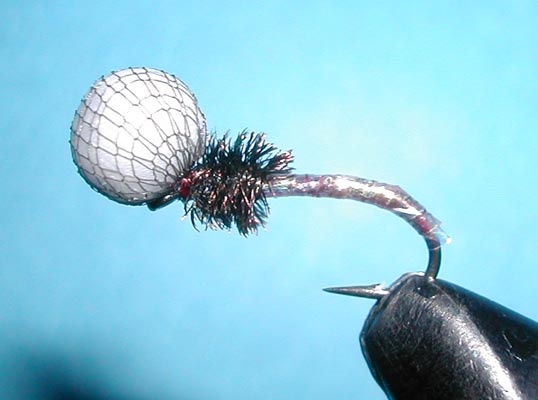 - Head: Plastazote, or other high-density foam cut into a strip. The size will depend on the size of your fly. Alternatively, foam bead wrapped in nylon stocking (left).