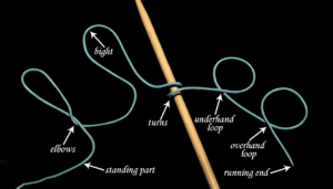 Improved Clinch Knot – Pass the end of the line through the eye. Wrap it around the standing end about five complete turns. Pass the end back through the loop beside the eye. Then pass the end under the final turn. Tighten the knot and trim the end.